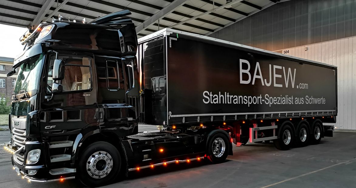 Ein Sattelauflieger, der speziell für den Transport von Stahlerzeugnissen hergestellt wurde.